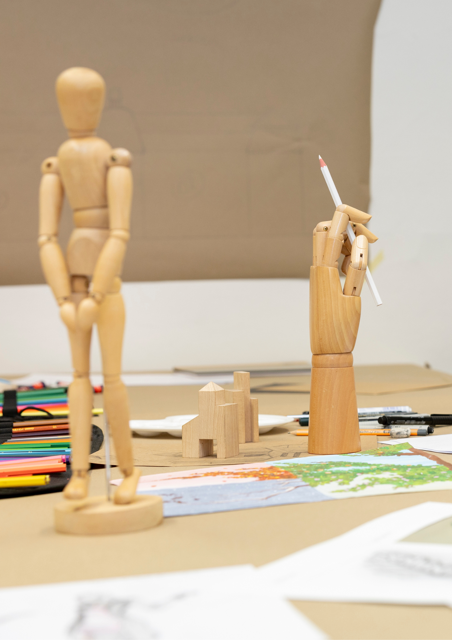 Das Farb-Licht-Studio wurde speziell für die Arbeit mit den Medien Licht und Farbe gestaltet. In diesem Raum untersuchen wir die Wechselwirkungen zwischen Licht und Körperfarbe durch gezielte Experimente und praktische Anwendungen. Dabei werden sowohl physikalische Grundlagen als auch gestalterische und wahrnehmungsbezogene Aspekte berücksichtigt.